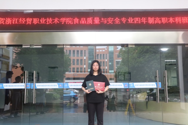 今年,该专业首届本科生毕业共47人。其中,毕业生邹真被录取为浙江农林大学食品加工与安全专业的研究生。其余46人均签约,就业率100%。目前,已签协议学生的专业对口率达到了83%。28名同学在检测行业或食品药品行业从事检测岗位。大家对专业的认可度非常高,通过学校四年的培养与自身的努力,能够在行业里面立住脚跟。